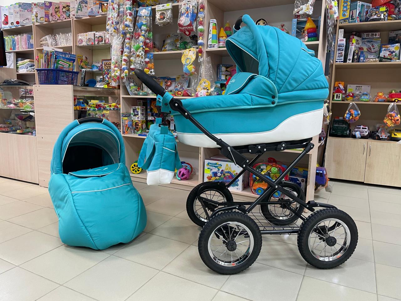 - Коляска классическая, люлька польского производства. Модель с большими надувными колёсами, которые обеспечивают плавный ход и отличную амортизацию. Шасси складное. Цвет: бирюзовый. Цена