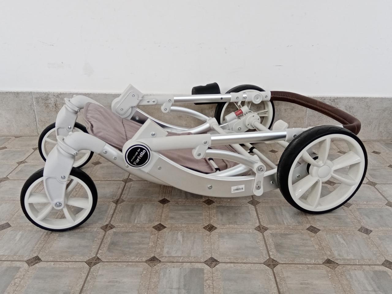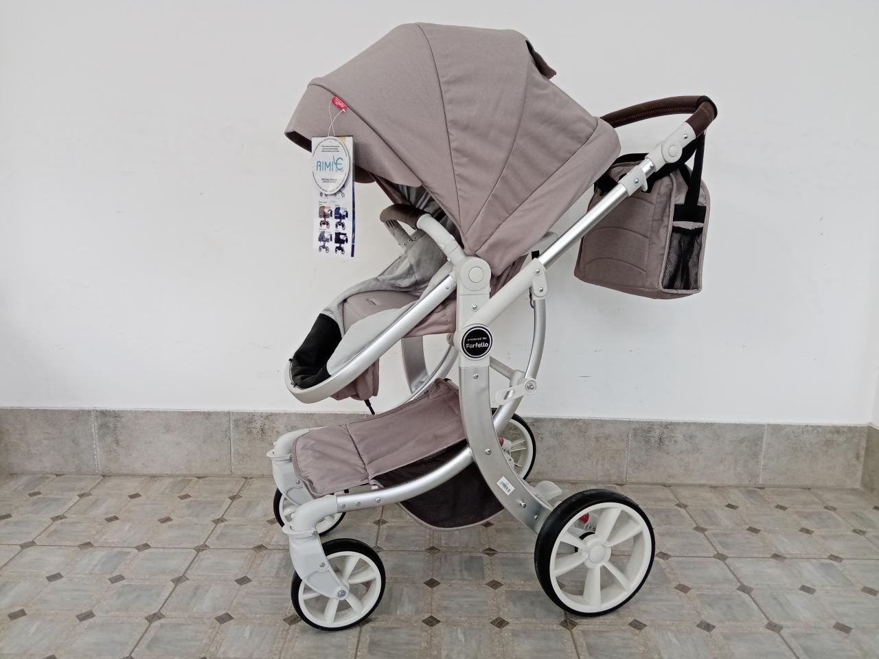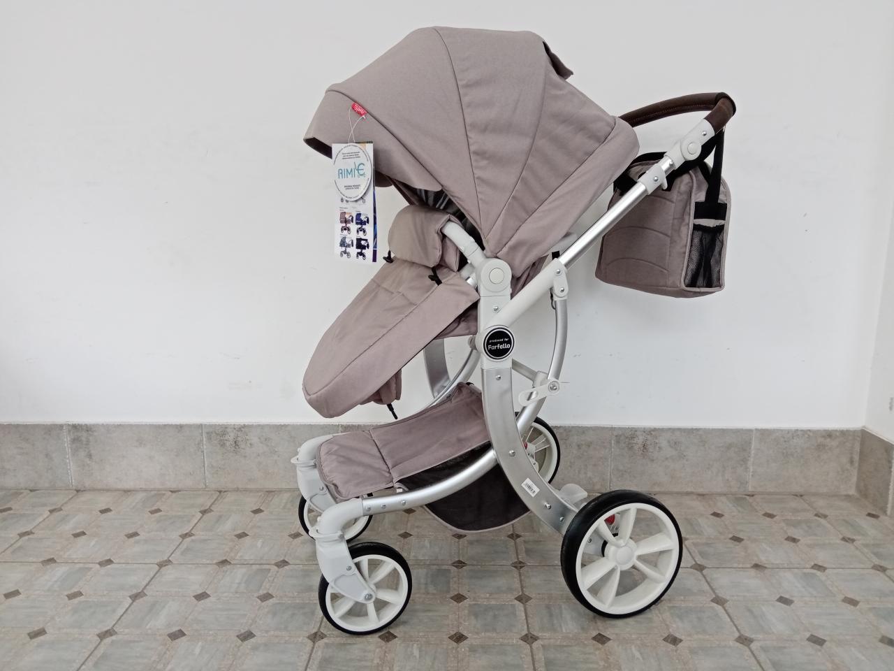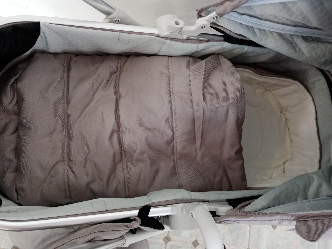 - Коляска-трансформер в нейтральном цвете на золотистой раме. Верхний модуль трансформируется из спального варианта в реверсивное сидение. Шасси складное. Полная комплектация. Цена