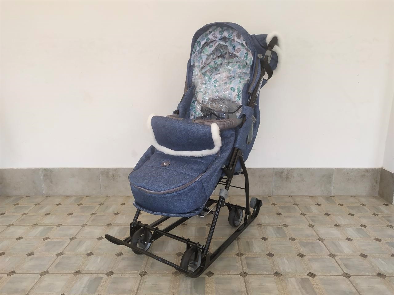 - Санки-коляска из джинсовой ткани тёмно-синего цвета. Глубокий капор, объёмный чехол на ножки. Компактное складывание. Удобная опция - выдвижные крупные колёса, которые позволят преодолевать сложные участки пути или перемещаться внутри зданий. Цвет нейтральный: серый. Полный комплект, исправны. Цена
